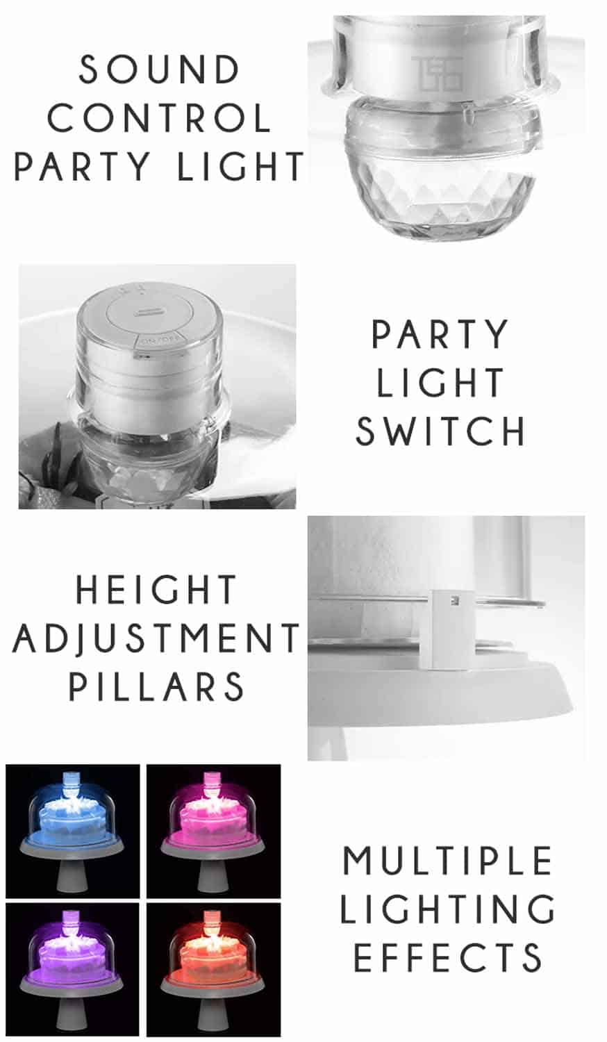 The Party Cake Dome will bring your cake to life with it’s sound activated LED party light. With multiple lighting effects the party dome can set the mood for any occasion. Made to fit an 8 Inch (20.32 cm) diameter cake this fun dome comes with extending pillars so you can adjust the height for taller cakes.